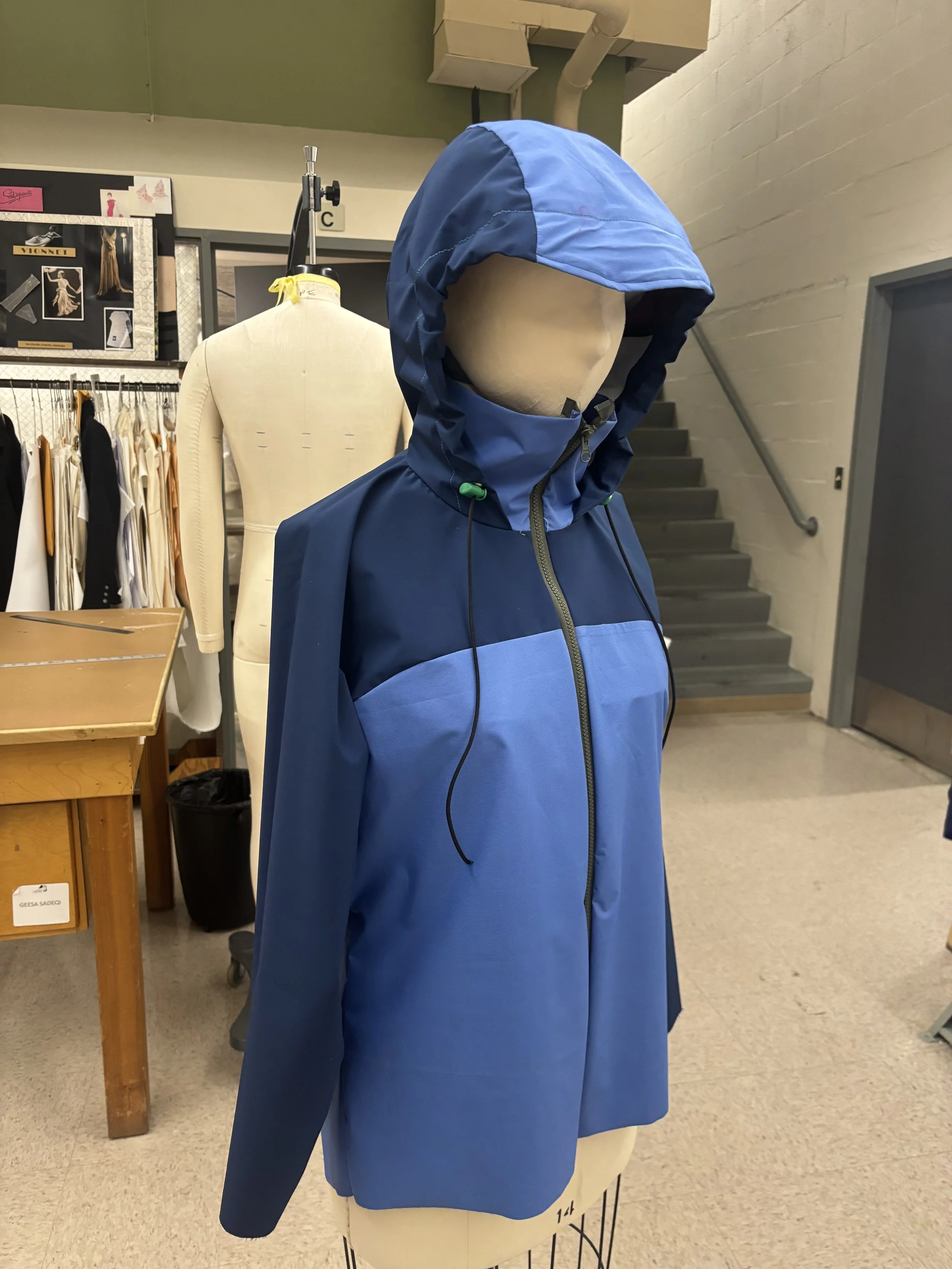 Unlined waterproof jacket with taped seams and sleeves with a combined raglan and yoke to eliminate a seam on top of the shoulder. This jacket has a separate hood and collar to keep the back of the neck warm even when the hood is down. The hem is longer on the back providing additional coverage for chilly lifts or snowy picnics.